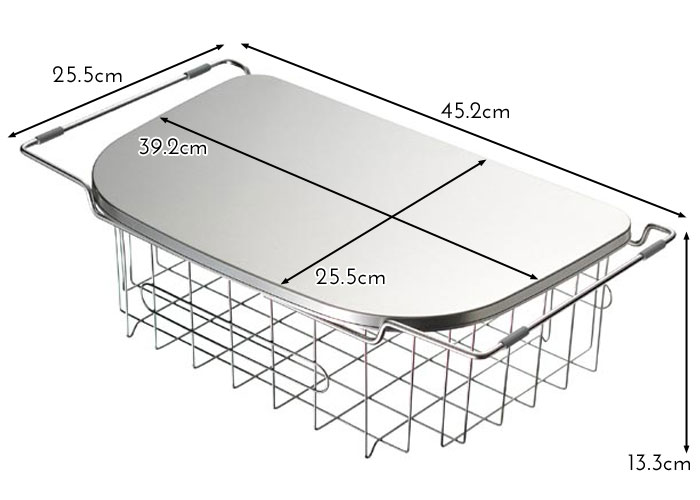 サイズ約 幅25.5×奥行45.2×高さ13.3(cm)(すべり止めゴム部含む)トレーサイズ:約 幅25.5×奥行39.2(cm)重量:約920g内容量水切りカゴ、トレー材質本体:ステンレス鋼(クロム18%、ニッケル8%)トレー:ステンレス鋼(クロム18%)すべり止めゴム:合成ゴム生産国日本製備考最大積載荷重/7kg使用可能なシンクの奥行内寸/約41〜43.5cm(伸縮しません)注意※他のサイトも運営しておりますのでタイミングにより在庫切れの場合は改めてご連絡いたします。