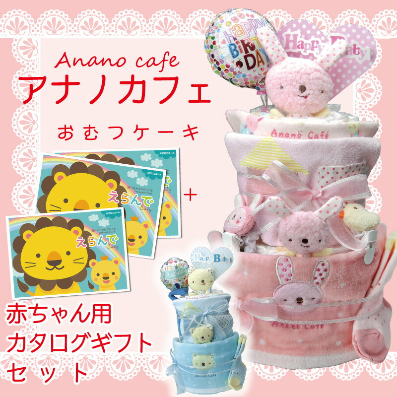 【送料無料サービス地域 関東〜九州】Anano cafe おむつケーキ+「えらんで」ニコニココースx3冊●アナノカフェのベビーグッズ6点セット(カシャカシャ・マスコット・スタイ・ソックス・ハンカチ・タオル)人気ブランドアイテム満載の出産祝いカタログギフト