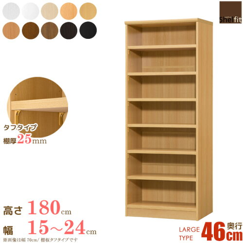 【サイズ】 ■奥行ラージ/棚板タフ タイプ 本体:幅15-24×奥行46×高さ178cm ※幅をお選び下さい 【材質】 本体:プリント紙化粧繊維板 塗装:ウレタン樹脂塗装 【商品仕様】 色:10色 [木目柄]ホワイトウッド、ライトナチュラル、ペアナチュラル、ナチュラル、ミディアムブラウン、ウォールナットブラウン、ブラウン、ダークブラウン/[無地]ホワイト、ブラック 可動固定棚6枚 棚板25mm厚(耐荷重30kg) 転倒防止用バンド付き ■棚板移動1.5cmピッチ ■幅木よけ加工済み ホルムアルデヒド放散区分:F★