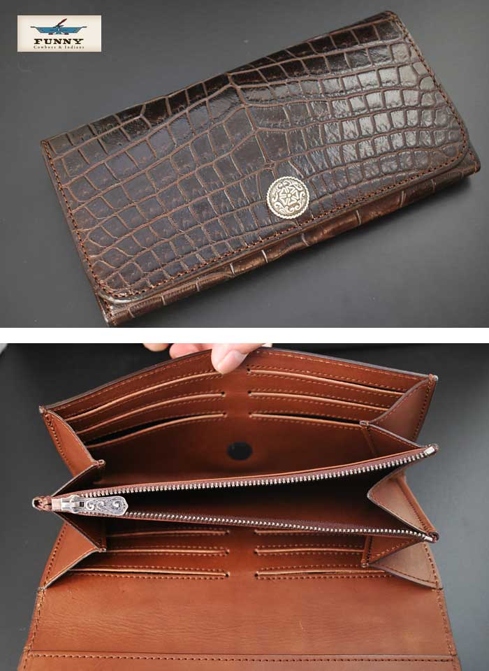 ■商品説明 ■メーカー名:FUNNY ORIGINAL 【ファニーオリジナル】■品名:トライフォード・ウォレット■素材:外装:ブラウン【BROWN】/ソルトウォーター・クロコダイル(ポロサス) 【S.W CROCODILE(POROSUS)】内装:ブラウン【BROWN】/牛皮革■サイズ:本体 / W/100mm H/203mm D/35mm■仕様:カードホルダーx16枚、小銭入れx1、大型ポケット(札入れ含む)x3■コンチョ:ビクター ■店長コメント これまでのFUNNYオリジナル・ウォレットのラインナップには無かった“三つ折り式”(TRIFOLD)のストラクチャーを採用したニューモデル。
